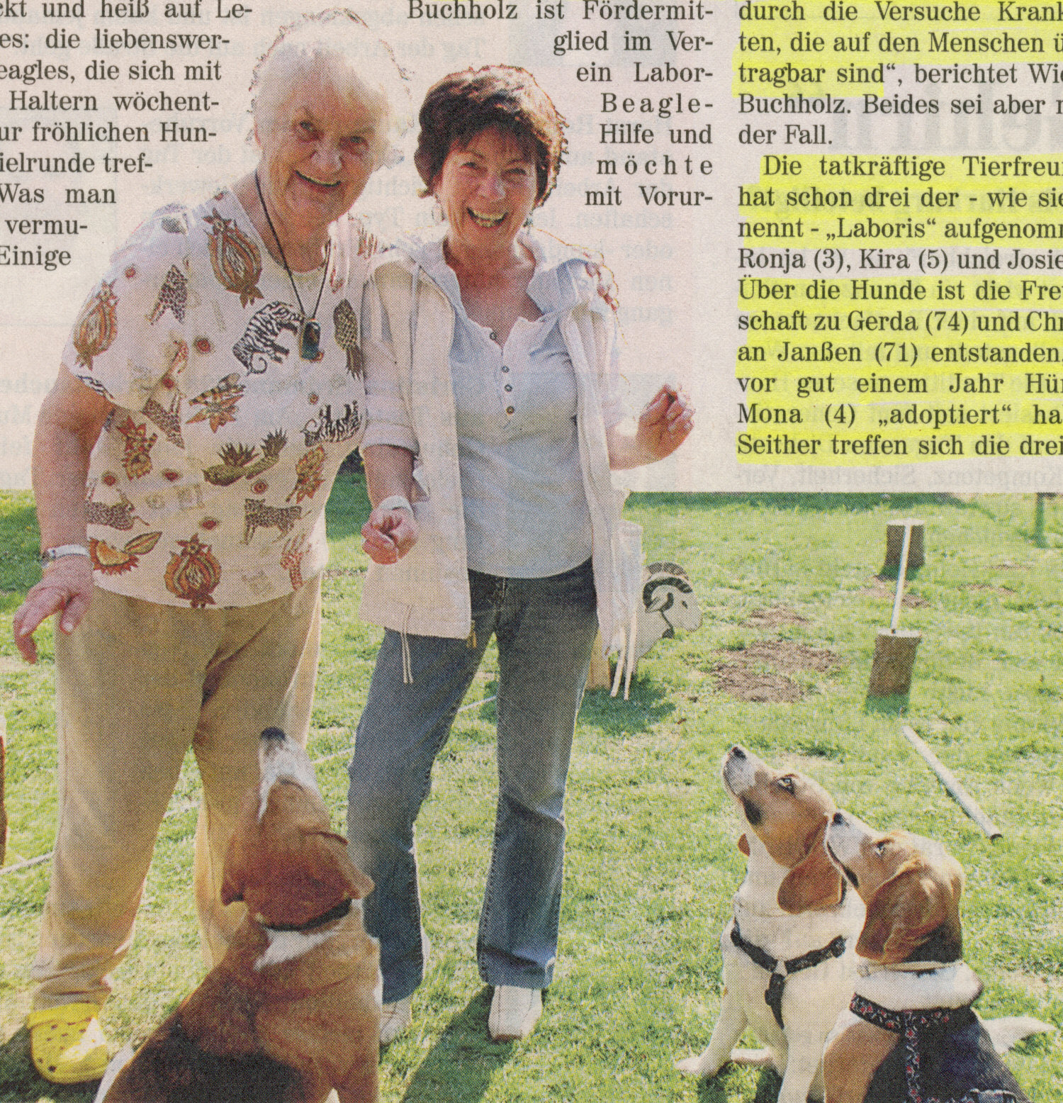 O jornal local do "concelho" (Landkreis) de Stade, onde vivo, publicou uma reportagem sobre uma senhora que adoptou três cadelas beagle oriundas de um laboratório. Nas suas palavras, muita gente hesita em dar este passo, na crença de que os animais têm traumas irreparáveis ou tenham sido infectados por doenças susceptíveis de se transmitirem aos humanos. Na verdade, a maior parte deles é usada para testar rações ou desparasitantes.