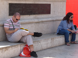 Sentei-me numa cadeira e reparei que, na mesinha ao lado, havia catálogos com as promoções da INCM na Feira do Livro. Descobri lá a Colecção "o essencial sobre", livrinhos que costumam custar entre 3 e 5 euros e que, na Feira, estavam a 1 euro, além de outras promoções interessantes. Uma vez na Feira, dirigi-me ao stand da INCM. A menina viu-se um pouco aflita para reunir todas as minhas escolhas. Procura daqui, procura dali, lá encontrou o que eu queria. E, faça-se-lhe justiça, foi simpática