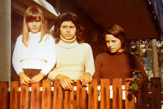 Também encontrei uma fotografia desses tempos. Da direita para a esquerda, a São (com dezasseis anos), a Rosário (dezoito) e eu (sete).